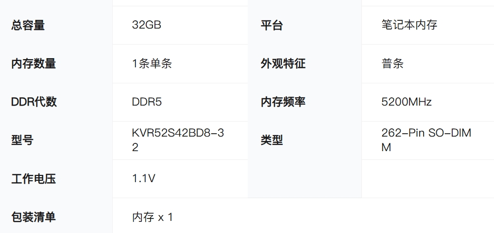 金士顿 (Kingston) 32GB DDR5 5200 笔记本内存条