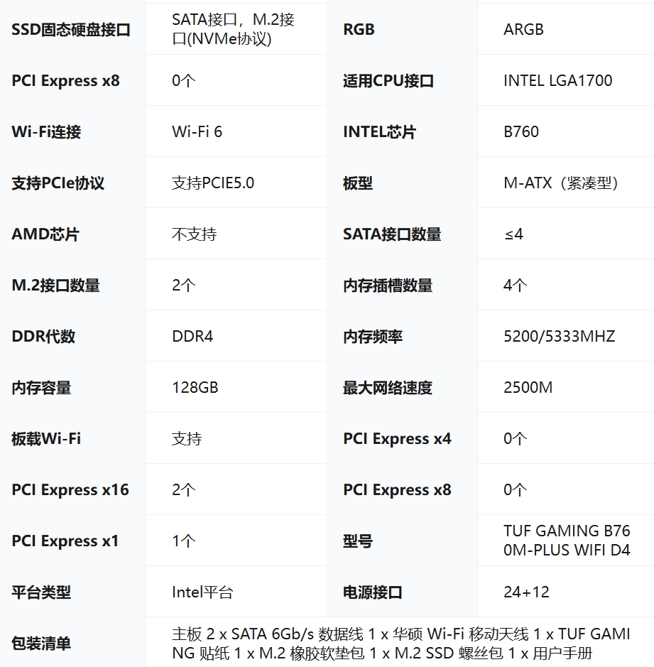 华硕TUF GAMING B760M-PLUS WIFI D4 重炮手主板 支持 CPU 13600KF/13400F(Intel B760/LGA 1700)