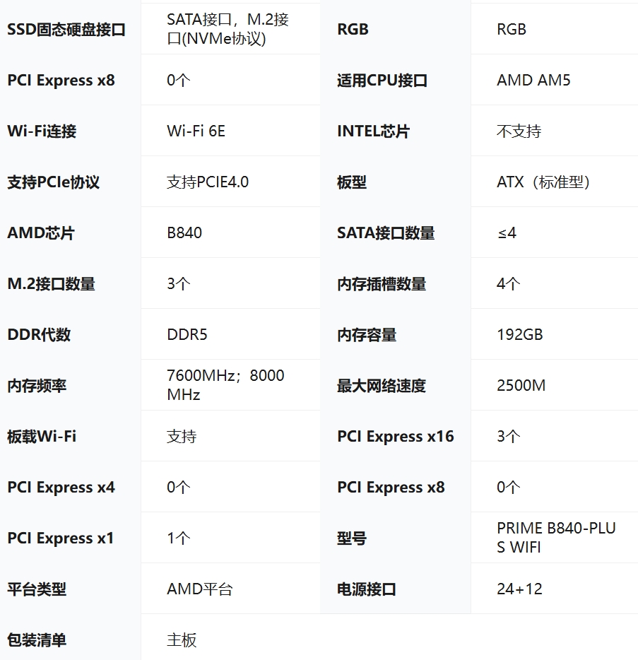 华硕(ASUS)PRIME B840-PLUS WIFI主板 CPU 7800X3D/9800X3D/9600X(AMD B840/socket AM5)