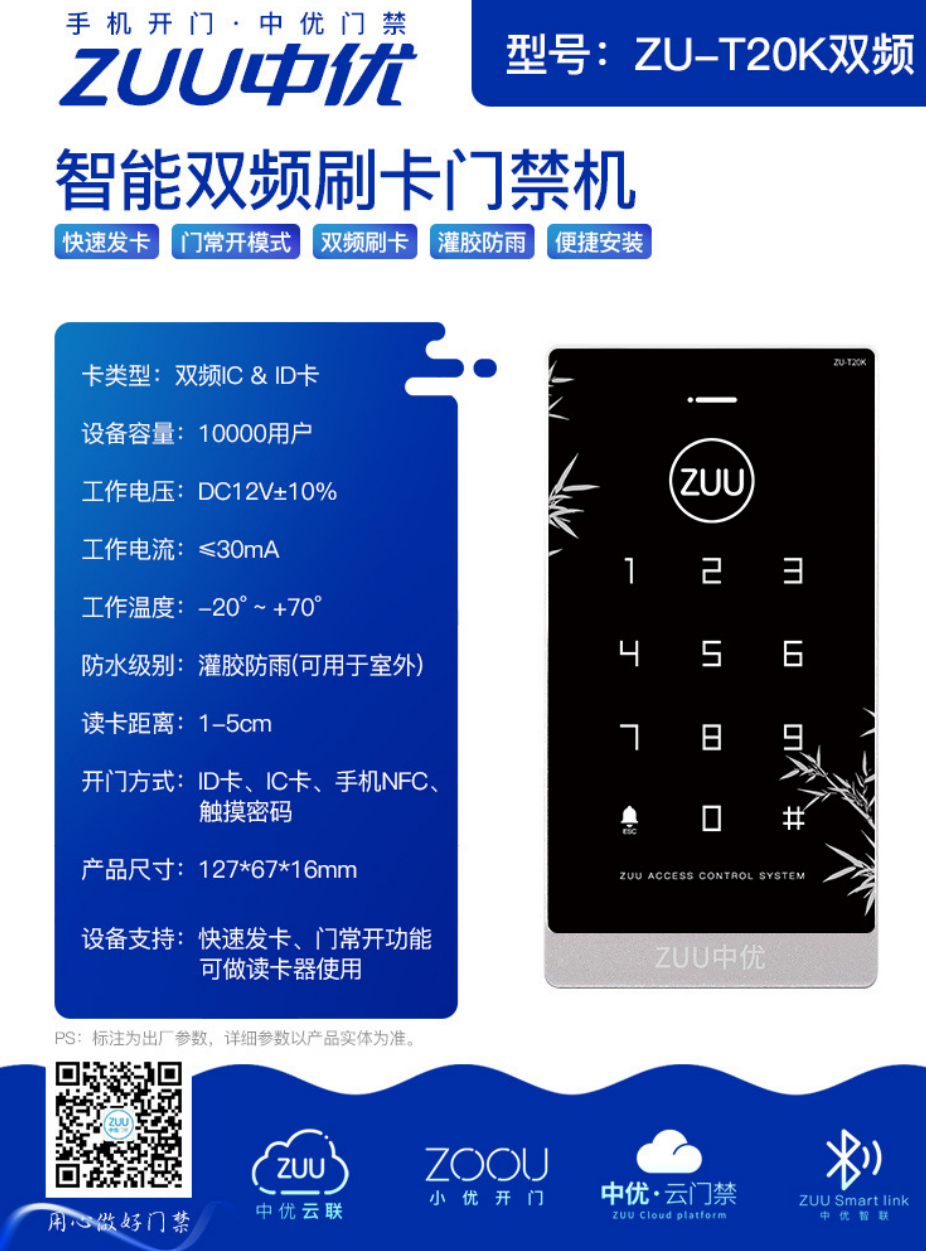 ZUU 中优 T20K - E/M 金属防雨感应卡门禁机,以硬核参数为底、多元功能为翼,深度适配户外多场景需求,为用户打造稳定、高效、灵活的户外门禁体验,重新定义户外金属门禁新标杆 。