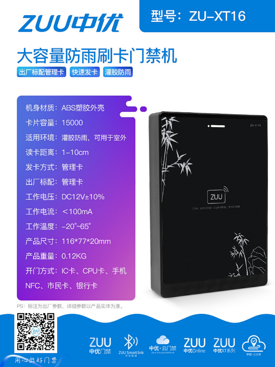 ZUU 中优 ZU - XT16 大容量防雨刷卡门禁机,以硬核参数为底、多元功能为翼,深度适配户外及人员密集场景,为用户打造稳定、高效、便捷的门禁体验,重新定义户外门禁新标杆