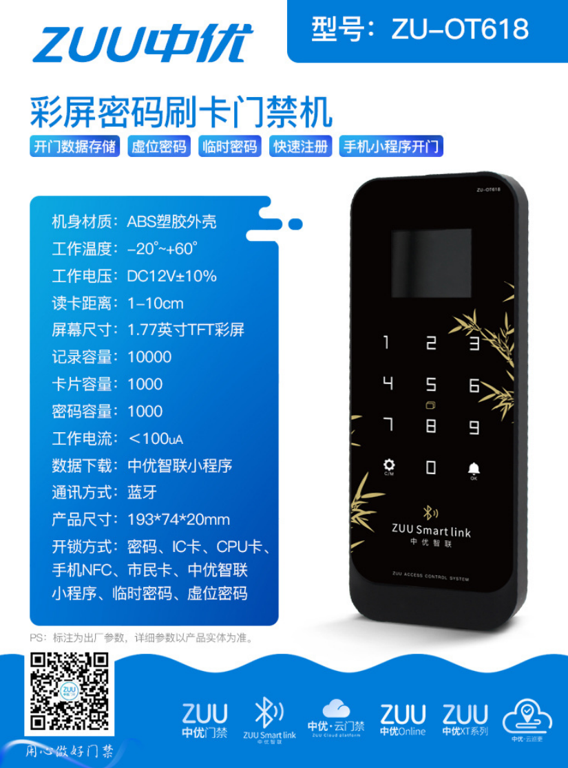 ZUU 中优 ZU-OT618 彩屏密码刷卡门禁机,以硬核参数为基石,多元功能为引擎,深度覆盖多场景需求,为用户打造安全、便捷、智能的门禁体验,是智慧门禁升级的不二之选,重新定义智能门禁新标杆
