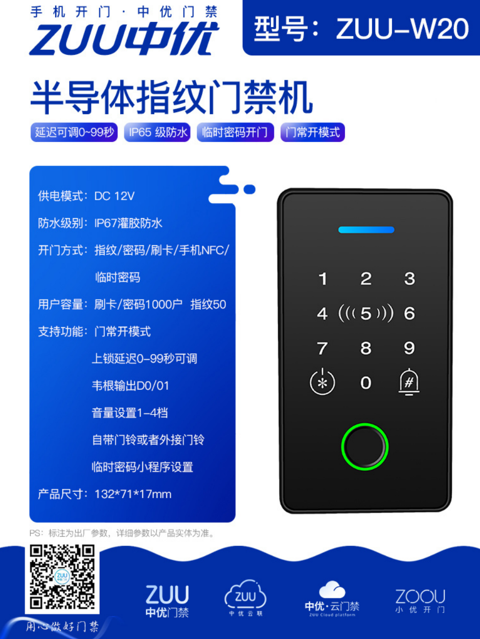 中优 ZUU - W20 指纹门禁机,以 多模识别、环境耐用、工程友好 ,成为家庭、小微场景 “安防首选”。不管是入户、商铺,还是工程安装,选它就对了 —— 让门禁管理 “更智能、更耐用、更省心”,重塑半导体指纹门禁价值体验!