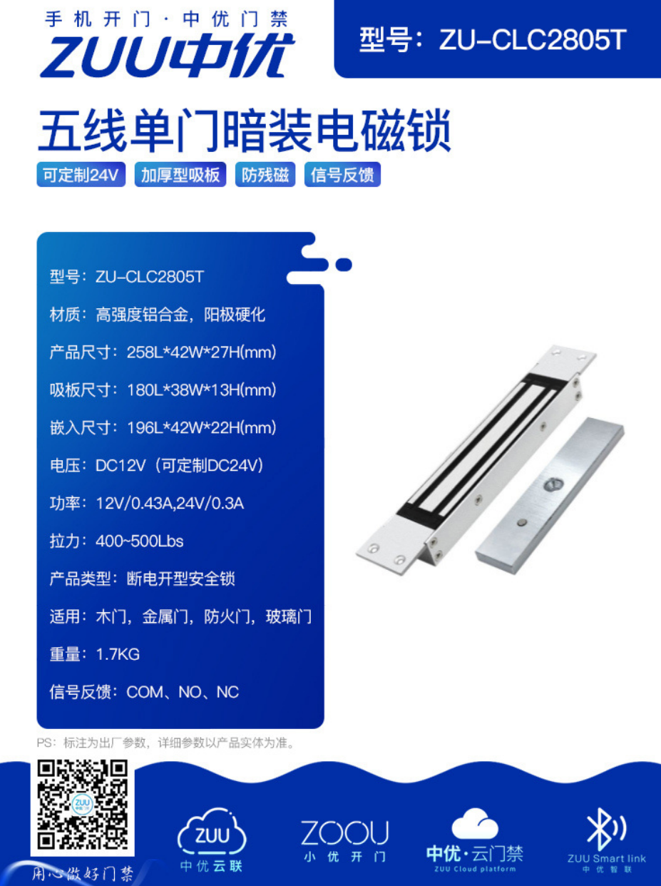 对于门禁工程商来说,在老旧小区、商业楼宇等门禁改造项目中,ZU-CLC2805T 电磁锁具有显著的优势 。它可以适配多种门型,无需对门体进行大规模的改造,降低了施工难度和成本。可定制的电压功能解决了不同场景下的供电适配难题,精准的尺寸设计保障了安装的稳定性。防残磁、断电开以及信号反馈等功能则提升了项目的整体品质和智能化程度,有助于工程商打造出可靠、智能的门禁改造方案,增强在市场中的竞争力,树立专业的工程形象。