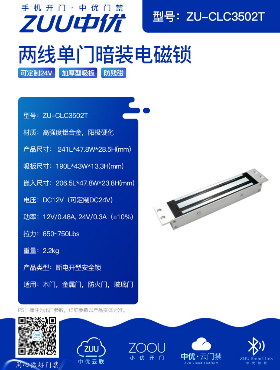 电压支持 DC12V(可定制 DC24V ),功率随电压精准适配(12V/0.48A,24V/0.3A ±10% ),满足不同项目供电需求;拉力达 650 - 750Lbs,强劲锁力抵御外力破坏,产品尺寸、吸板尺寸、嵌入尺寸经过设计,可融入各类门体结构。