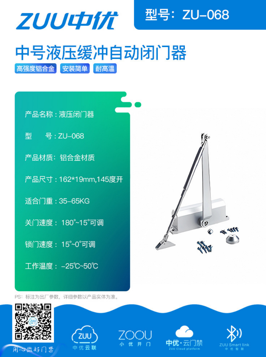 中优 ZU - 068 中号液压缓冲自动闭门器,以材质适配、精准调控、宽温稳定,覆盖家庭、小型办公、商铺等场景。无论守护家人安全,还是优化办公、经营体验,它都能精准契合需求,选择安装,为门控场景注入安全与便捷,让每一次关门都更可靠 !