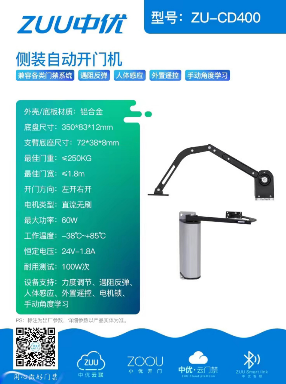 中优 ZU - CD400 侧装自动开门机,以硬核配置、智能控制、宽域适配,为物业、业主、商业场所提供优质门控方案。无论是社区门禁升级,还是商业场所智慧改造,它都能精准契合需求,现诚邀携手,用智能门控重塑通行体验,开启便捷、安全、高效的门控新时代!