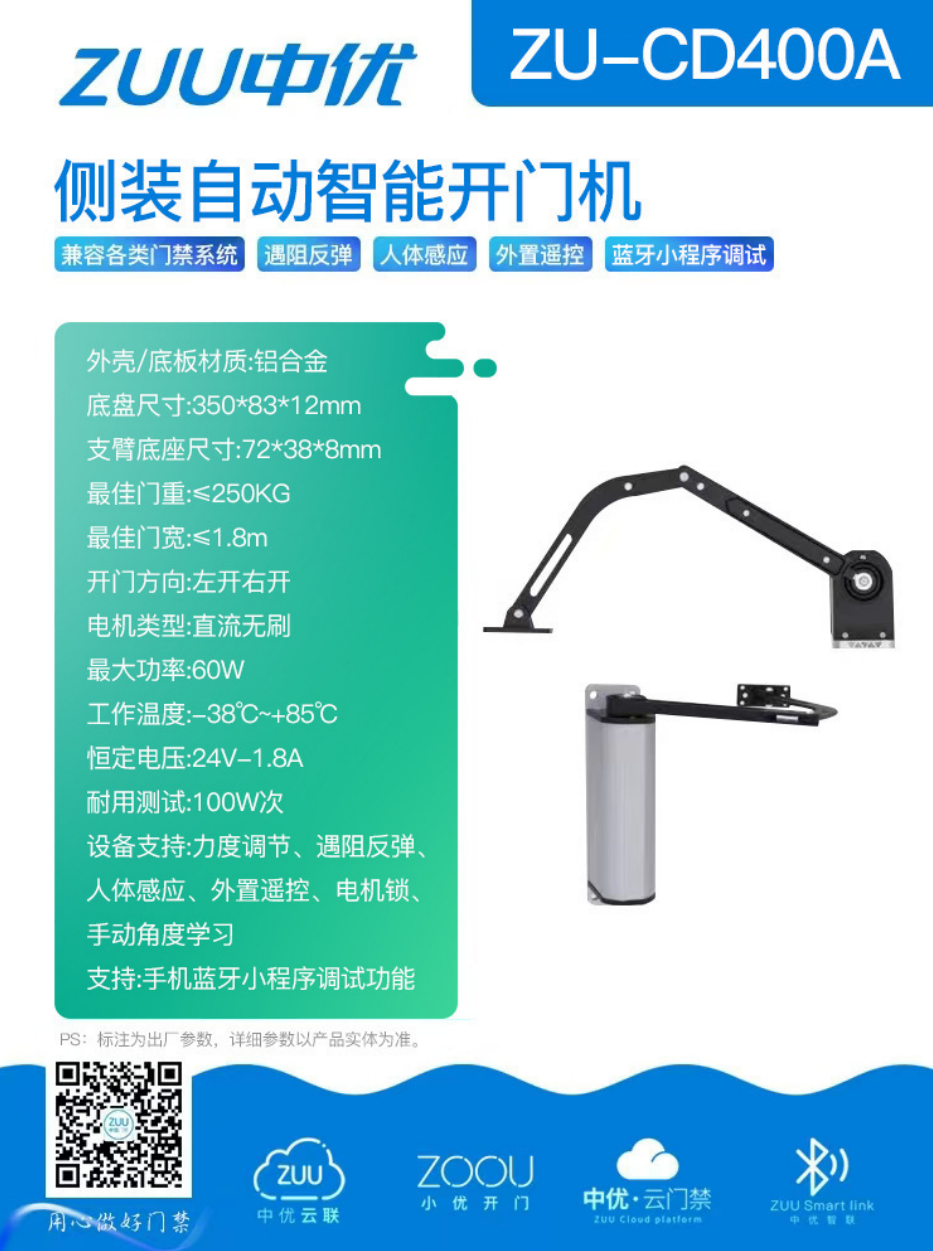 中优 ZU - CD400A 侧装自动智能开门机,以扎实硬件、丰富智能功能,为物业、业主、商业场所提供省心、便捷、安全的门控方案。不管是社区门禁升级,还是商业场所智慧改造,它都能精准契合需求,现在携手选用,让智能门控为生活与经营,开启更多便捷可能