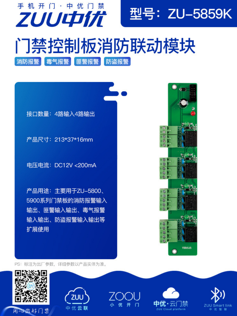在门禁系统中,消防、安全报警联动是保障人员生命与财产安全的关键环节。中优 ZU-5859K 门禁控制板消防联动模块,凭借多报警类型适配、4 路输入输出拓展、小体积高集成等特性,成为门禁安防的 “应急响应枢纽”,为 ZU-5800/5900 系列门禁板赋予全面报警联动能力。
