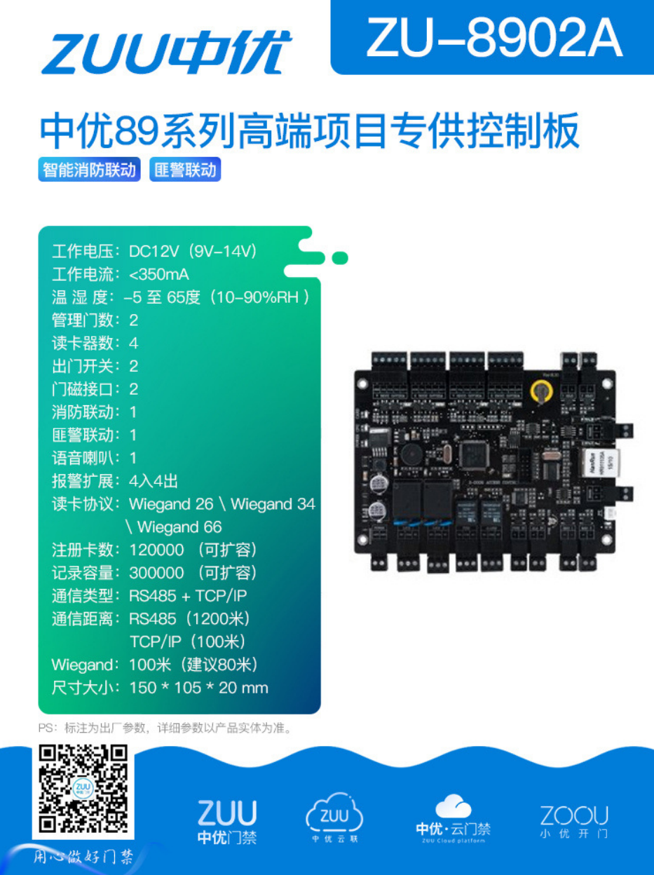 在高端门禁项目里,像商业楼宇、高端园区这些地方,对门禁的智能化、安全性和联动性要求特别高。中优 ZU-8902A 控制板作为中优 89 系列高端项目专供产品,凭借其多门管理、智能联动以及强大的拓展能力,成为这些高端场景门禁系统的 “智能管家”,为构建安全、高效、智慧的门禁体系提供有力支撑。