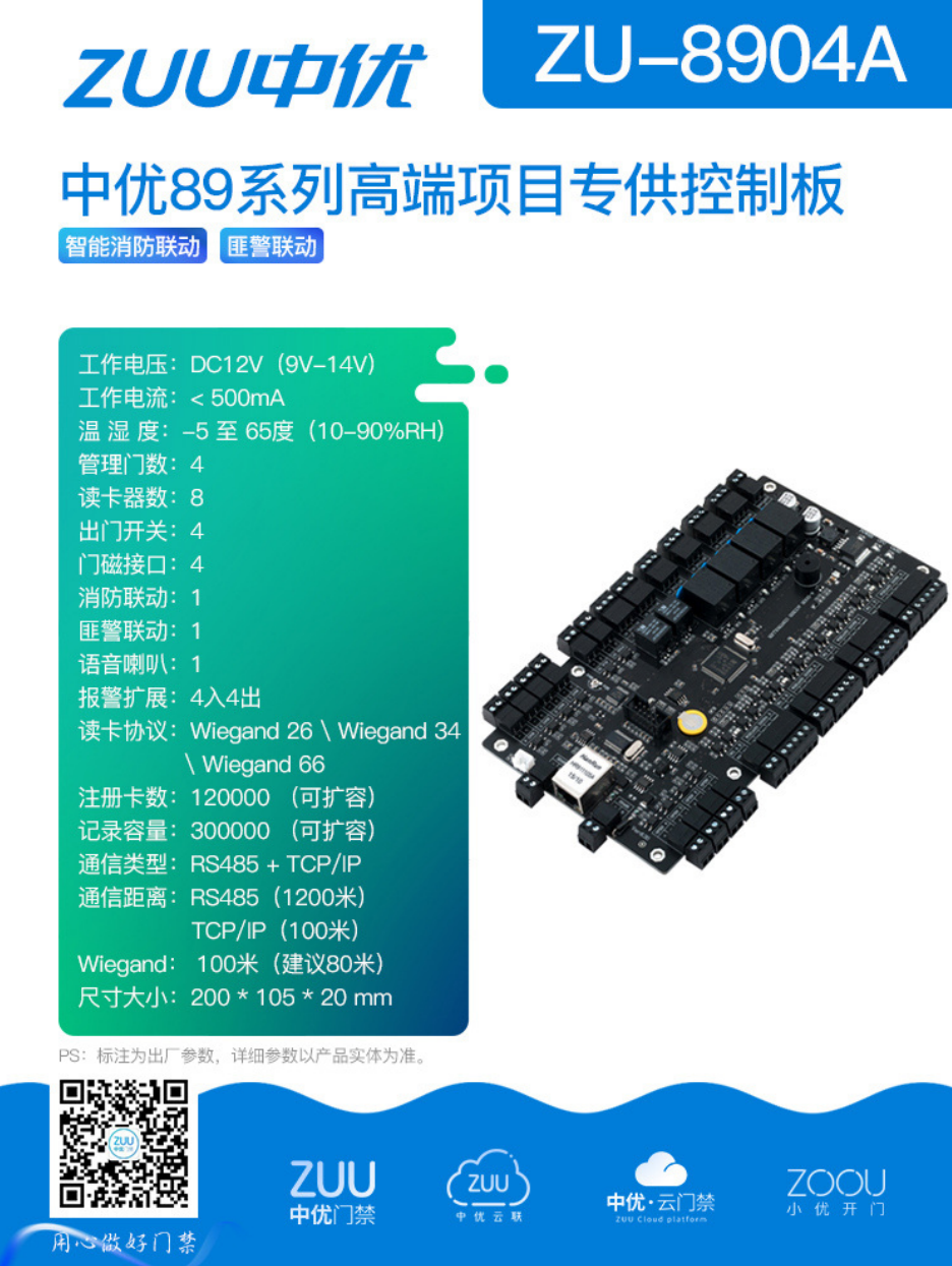 在高端门禁项目(如商业综合体、甲级写字楼、高端园区 )中,需统筹多门管控、联动消防 / 安防系统、保障海量数据管理。中优 ZU-8904A 中优 89 系列高端项目专供控制板,凭借多门管理、智能联动、大容量存储等特性,成为高端门禁项目的 “智能中枢”,构建高安全、智能化的门禁管理体系。