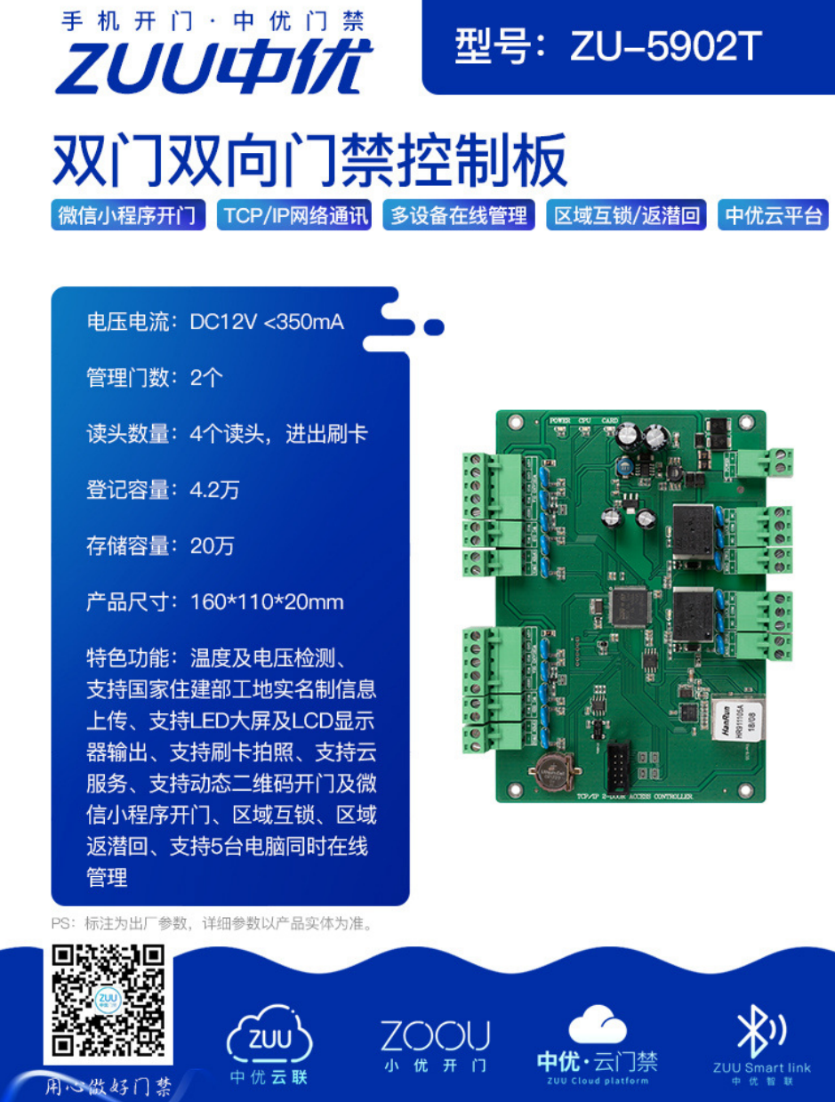 中优 ZU-5902T 双门双向门禁控制板,以双门全流程管控为核心,多协议通讯拓展智慧边界,特色功能适配多元场景,多设备协同提升管理效率,成为双门场景的 “智能管家”。无论企业办公、住宅小区还是建筑工地,都能为双门门禁注入智能化、精细化管理能力,让人员通行更安全、管理更高效,是构建智慧双门门禁网络的核心引擎 。