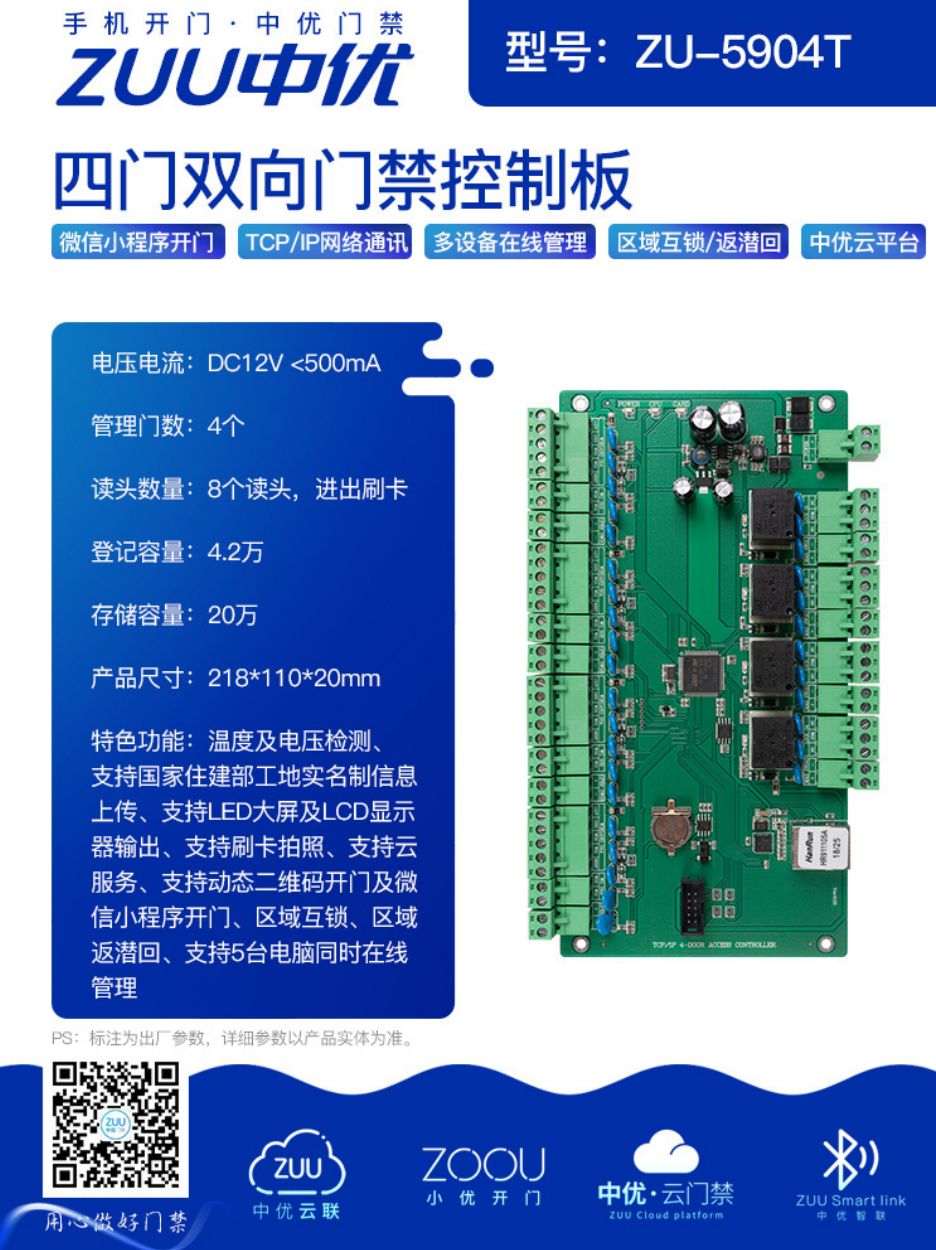 在大型场所(如工厂、园区、写字楼 )的多门门禁管理中,需高效统筹多门权限、保障人员有序通行。中优 ZU-5904T 四门双向门禁控制板,凭借四门双向管控、多协议通讯、丰富拓展功能,成为多门门禁系统的 “智慧大脑”,构建智能化、精细化的门禁管理体系。