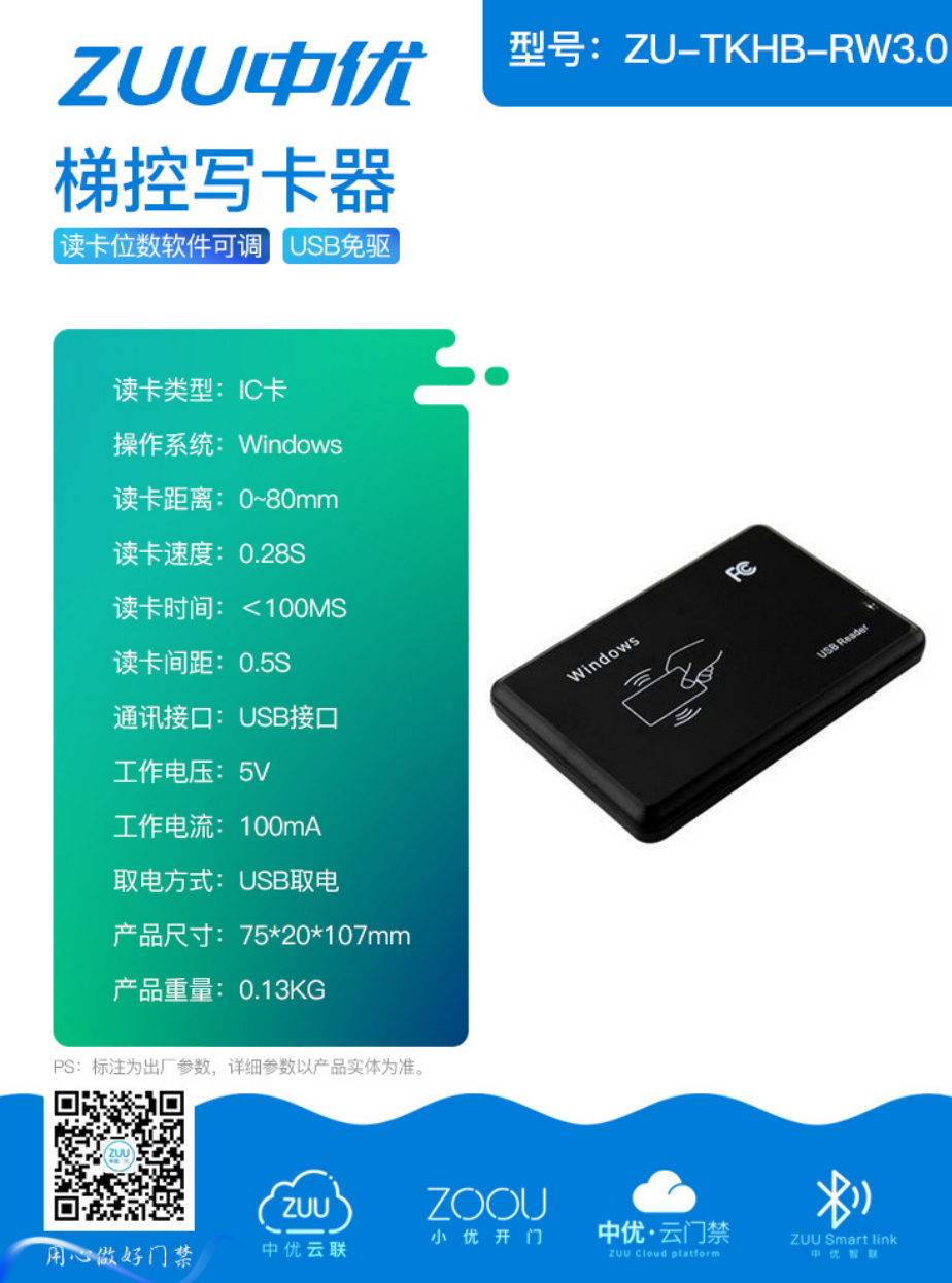 在梯控系统里,写卡器是赋予 IC 卡乘梯权限的关键设备。中优 ZU-TKHB-RW3.0 梯控写卡器,凭借 IC 卡精准读写、软件灵活配置、即插即用等特性,成为电梯权限管理的 “智能钥匙管家”,让梯控权限赋值高效又精准。