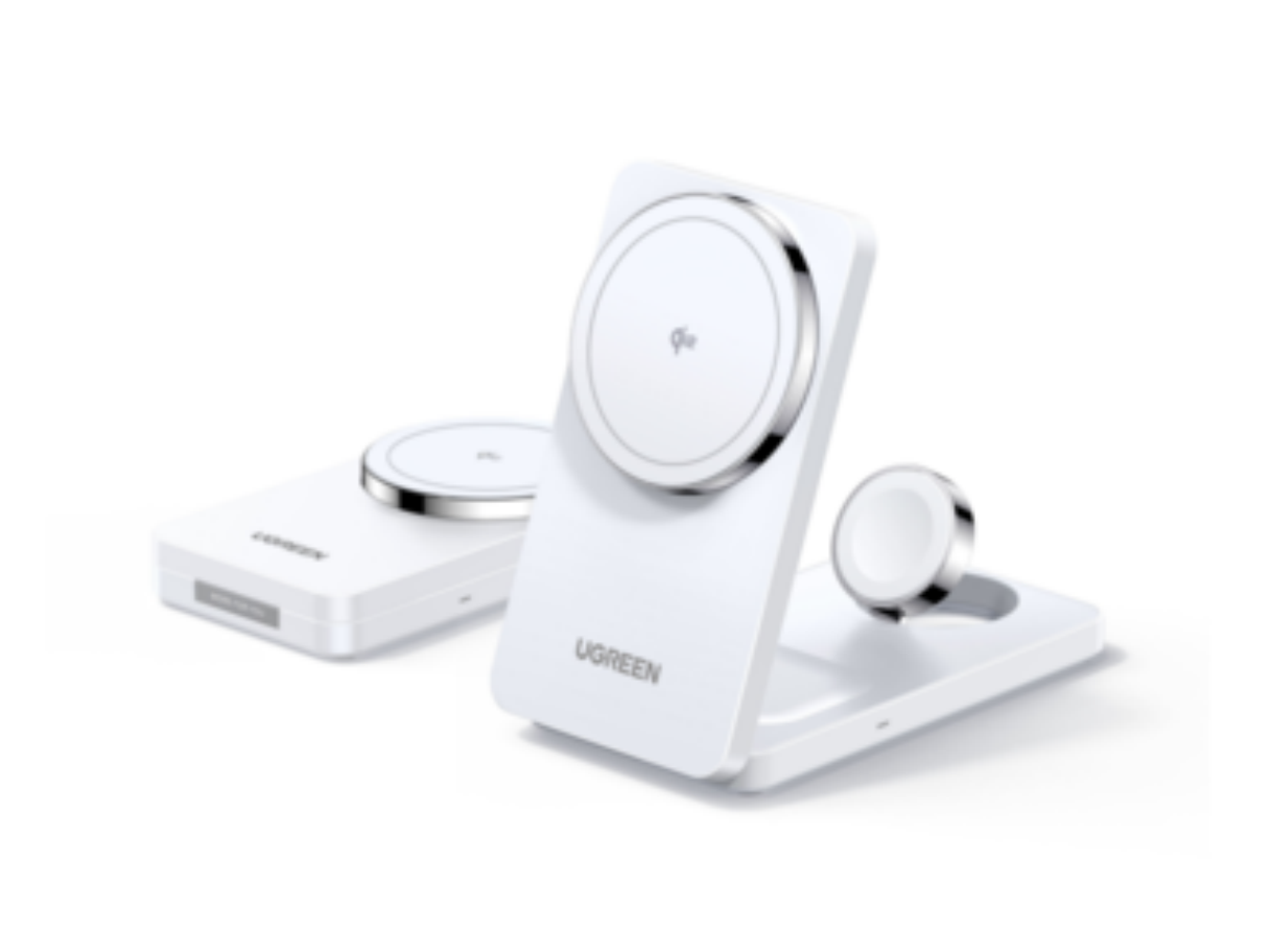 W707,25W 三合一折叠 手机磁吸无线充电器(MPP款)功率:25W输入:USB-C输出:磁吸区Qi2-15W,底座区Qi2-5W,手表区-5W协议:PD,QC,Qi2材质:PC+ABS/(94-V0防火阻燃)尺寸:116(L)*66(W)*46(H)mm配件:1米 3A C-C线包装:彩盒,白色 三合一,产品条码:6941876230280,重量(g):495,箱规:34,整箱毛重(kg):18.57,整箱尺寸(cm):48*38*28,起订量:5