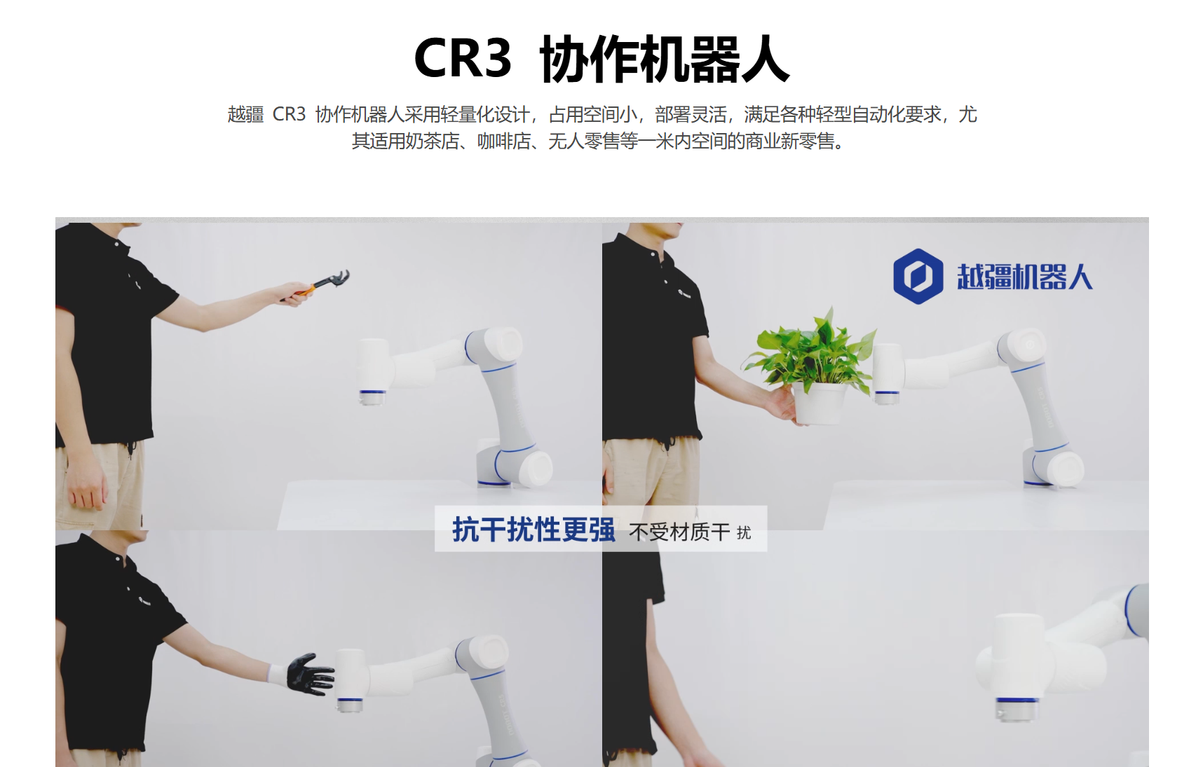 产品名称 CR3A 本体重量 16.5kg 最大负载 3kg 工作半径 620mm 最大直线距离 2m/s 关节活动范围 J3±155°其他关节±360° 关节最大速度 J1/J2 180°/s J3 223°/s J4/J5/J6 223°/s 末端I/O DI 2路 DO 2路 AI 2路(与RS485复用) 重复定位精度 ±0.02mm IP等级 IP54 温度范围 0°-50℃ 典型功率 120W 安装方式 任意角度 本体至电柜缆长度 5M 材质 铝合金ABS 塑料