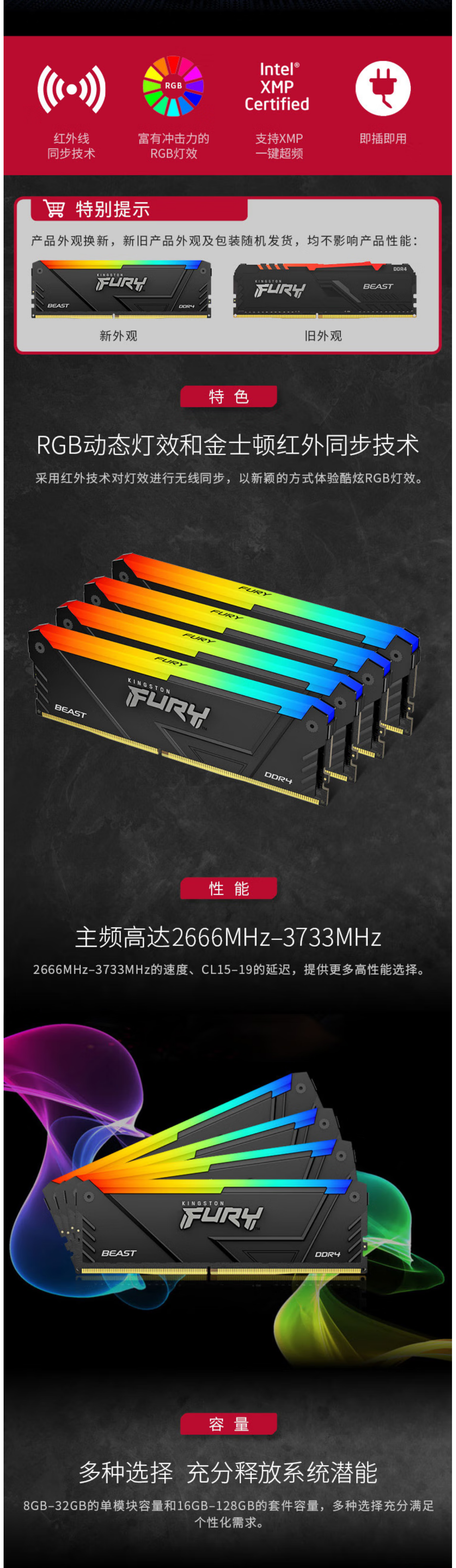 金士顿 (Kingston) FURY 16GB DDR4 3600 台式机内存条 Beast野兽系列 RGB灯条 骇客神条
